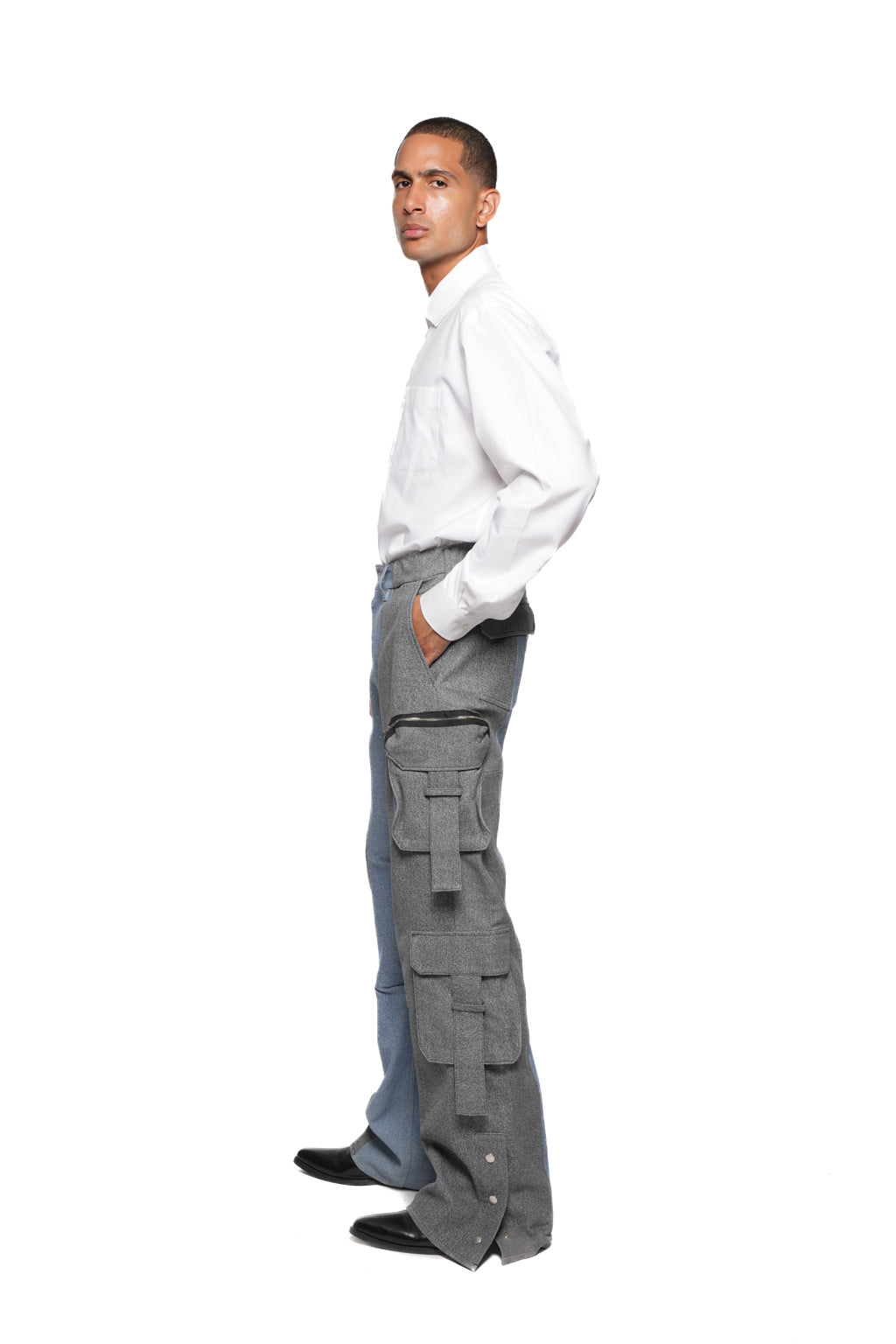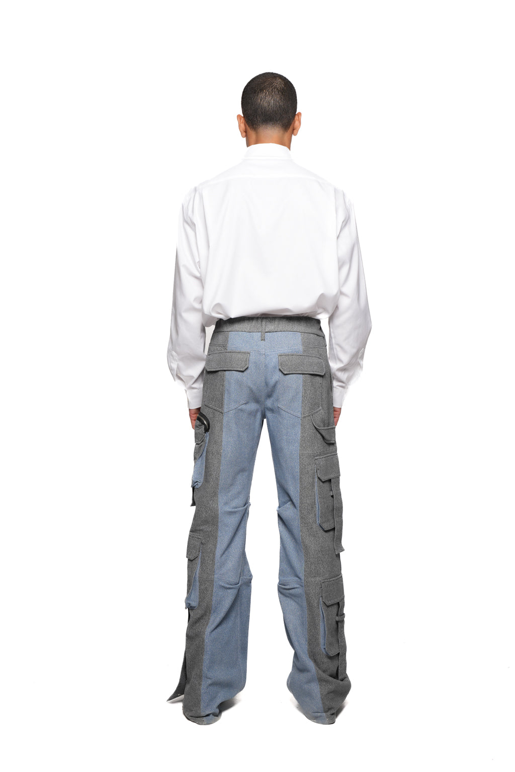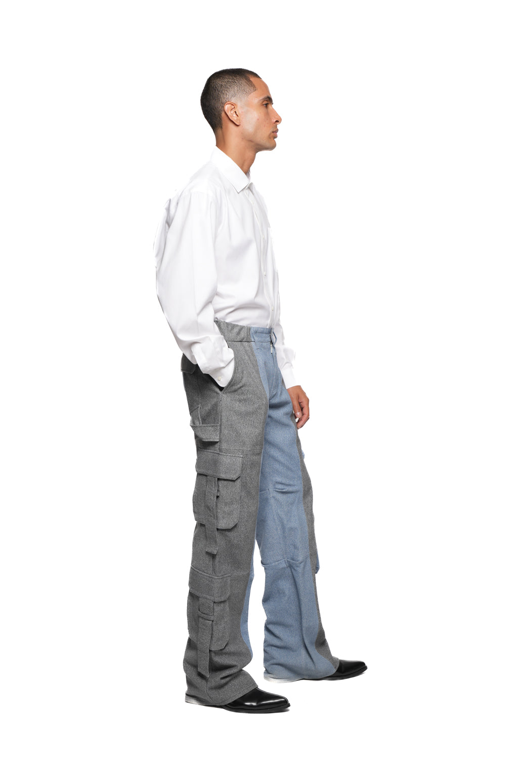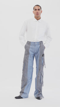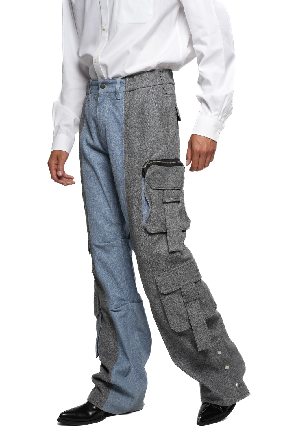 - Wide-leg cargo pants with contrasting denim panels